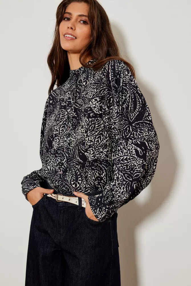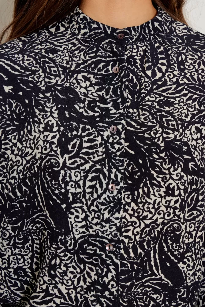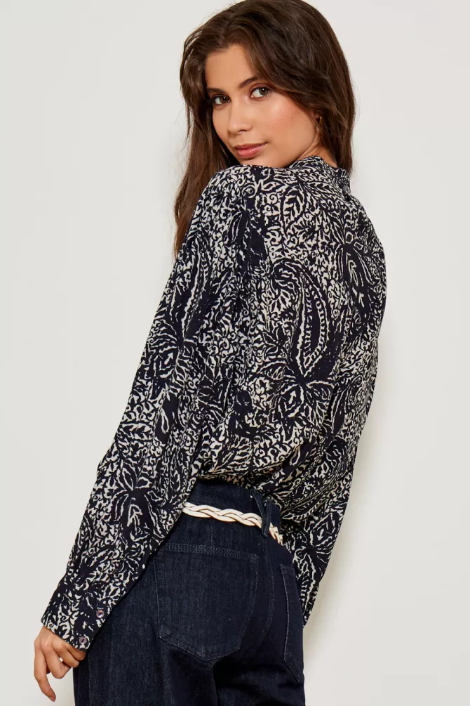 Chemise impriméeCoupe droiteCol rondManches longuesFinition arrondie sur le fondNotre mannequin porte une taille S.