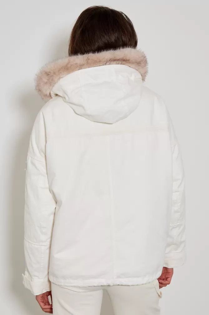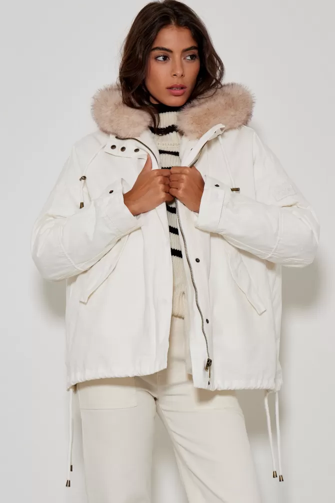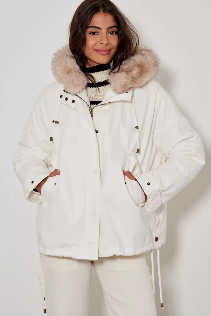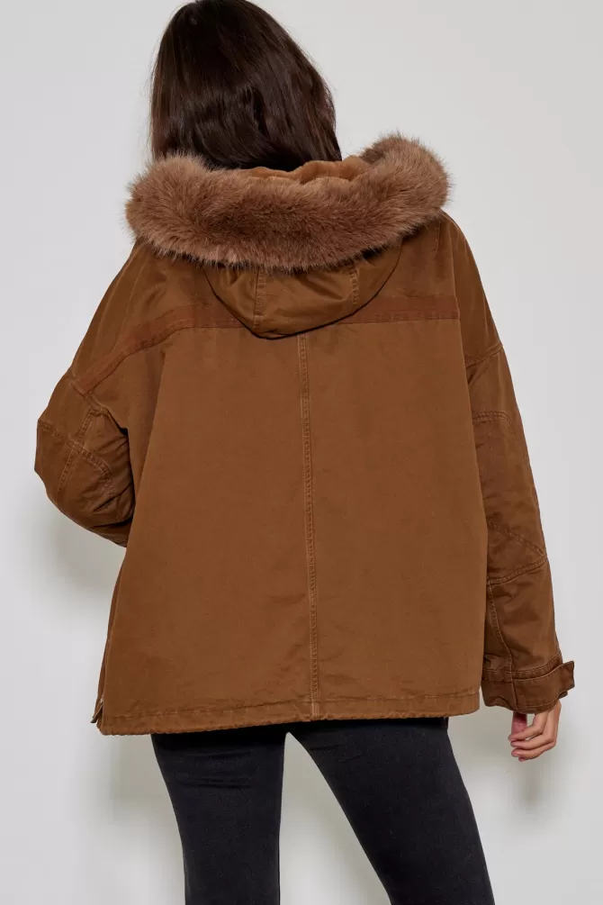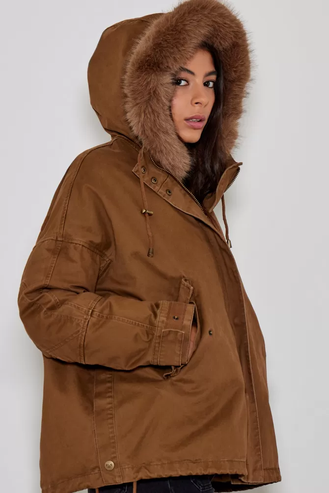 Parka looseCoupe courte et largeFermeture cachée sous rabat2 poches sur le devantCapuche avec col en fausse fourrureDo…