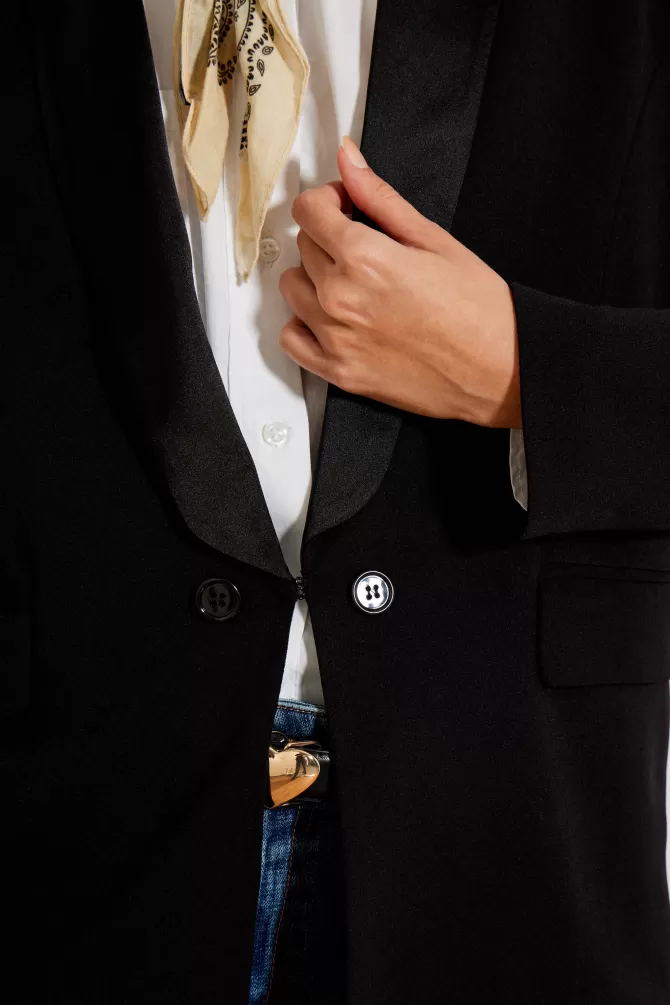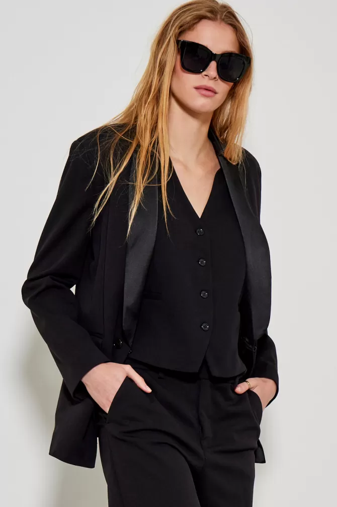 Veste BlazerCol tailleurCoupe droite2 poches sur le devantFermeture à crochetNotre mannequin porte une taille S.